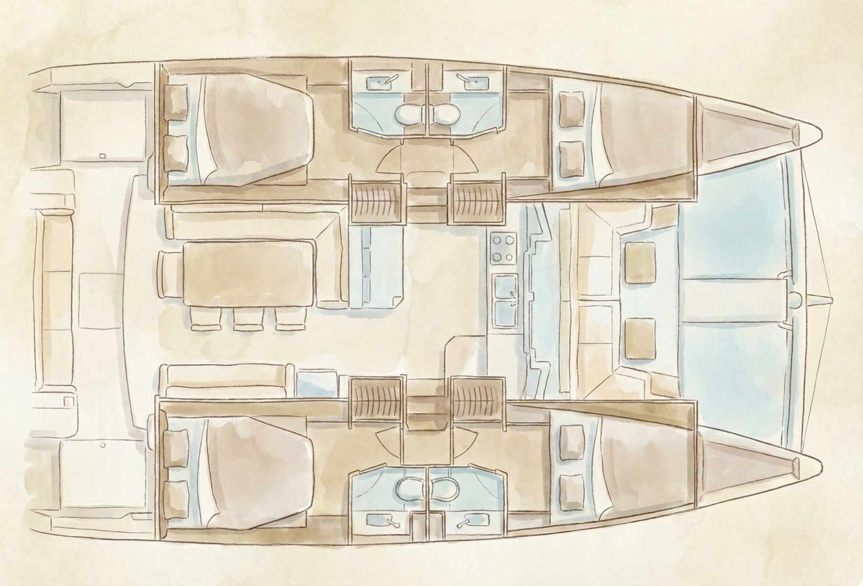 У каждого — своё место на борту. Обычно живём в двухместных каютах: по два человека в каюте. По возможности расселяем в однополые пары. Как именно — договоримся уже на месте, когда все соберутся.